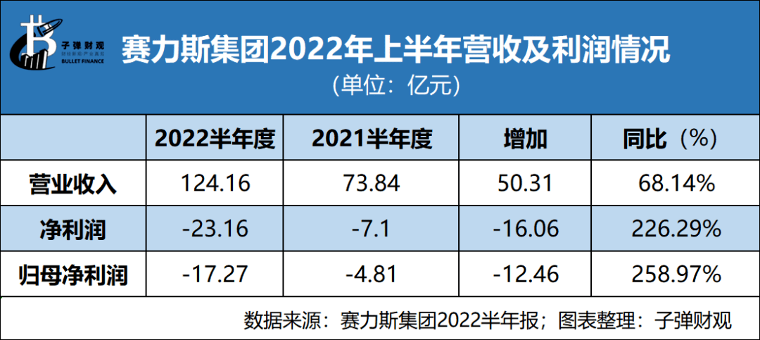8月20日,赛力斯集团发布2022半年报数据:2022上半年赛力斯集团营业收入124.15亿元,同比增长68.14%;净利润亏损23.16亿元,同比扩大226.29%;归母净利润亏损17.27亿元,同比扩大259.79%。