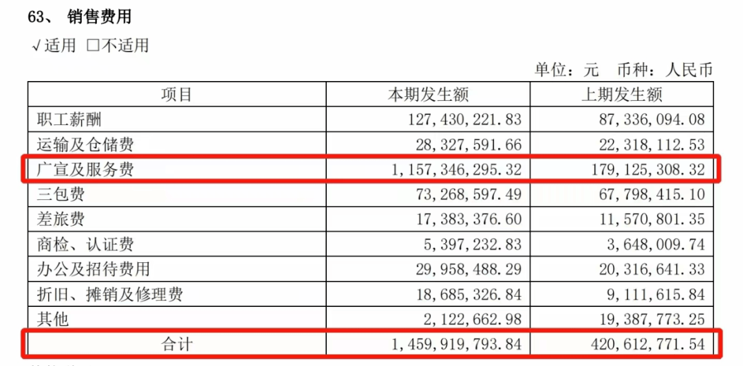 如果细分来看,营销费用的中的大头是“广宣及服务费”达到了11.57亿元,占营销费用总额的79.27%,而在上年同期的这笔费用才1.79亿元,同比增速达546.11%。