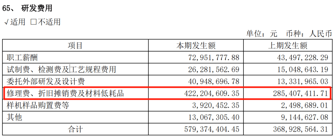 在这笔5.79亿元的研发费用中,“修理费、折旧摊销费及材料低耗品”达到了惊人的4.22亿元,占总研发费用的72.87%。与之对比的上年同期2.85亿元,占同期研发费用的77.36%。