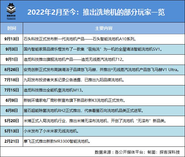 伴随厂商们纷纷杀入,洗地机产品上新节奏也不断加快。据「探客深科技」观察,今年以来,小米、石头、追觅、九阳、萤石、米博等诸多企业都陆续推出了自家的洗地机产品,加速布局洗地机领域。