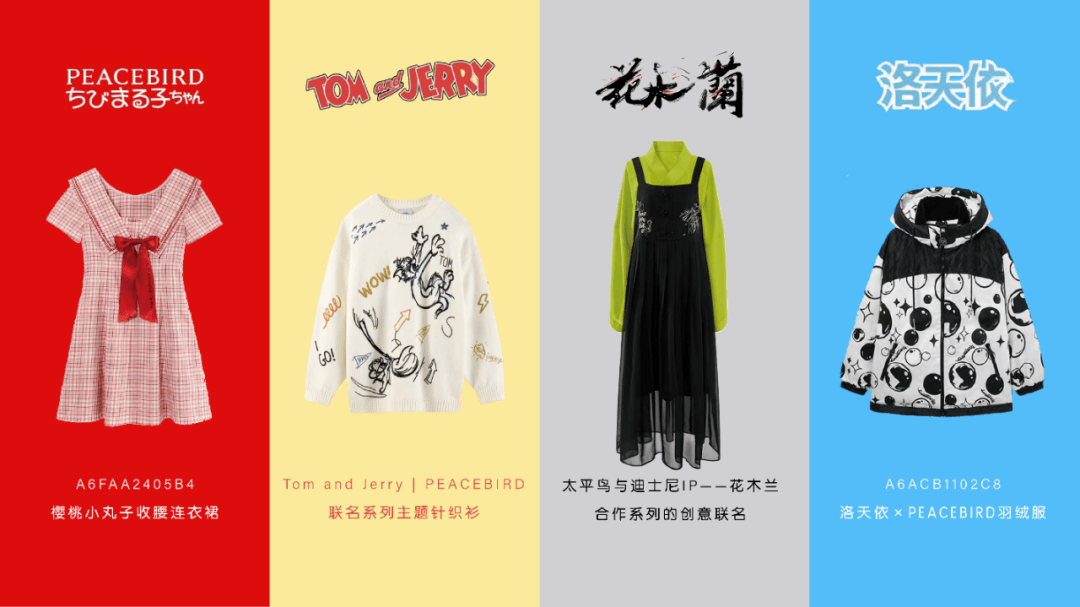 在国潮、联名款备受年轻消费群体欢迎之时,太平鸟表现也非常活跃。据悉,太平鸟仅在2020年,就推出了50余款IP联名系列,既有飞跃、红双喜等这样的国产老品牌,也有花木兰、大理寺日志、山海经等传统文化元素,还有新世纪福音战士、火影忍者、樱桃小丸子等知名动漫IP,多角度迎合年轻消费者的喜好。