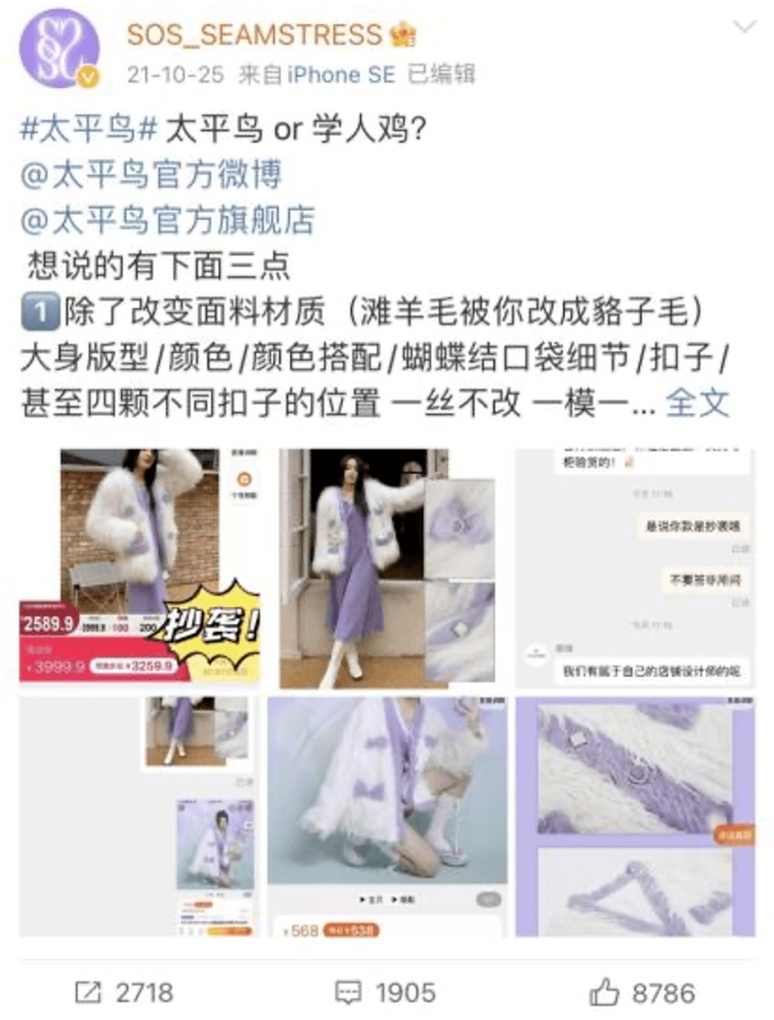 2021年10月,国内一家小众原创服装品牌官方微博、时尚博主SOS_SEAMSTRESS称,其旗下一款服装被太平鸟“1:1抄袭”“甚至四颗不同扣子的位置一丝不改、一模一样”。而后,被指抄袭的服装被太平鸟下架。
