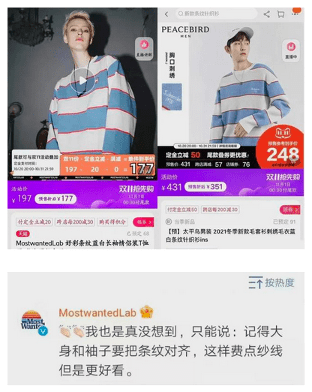 太平鸟曾推出的一款蓝白条纹上衣,跟原创品牌MostwantedLab旗下服装相似,并被MostwantedLab吐槽:“没想到”“记得大身和袖子要把条纹对齐,这样费点纱线但是更好看”。