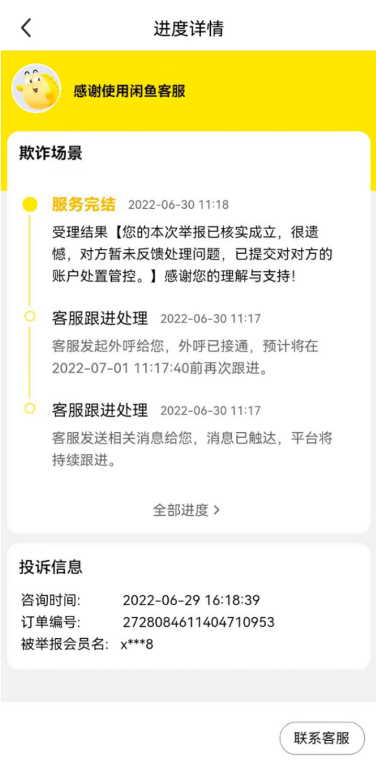 但由于他提前确认收货,无法通过闲鱼追回款项,只能通过举报措施要求平台封禁这个骗子账号。而这个多次倒卖游戏账号的卖家账户只是被平台管控处理。