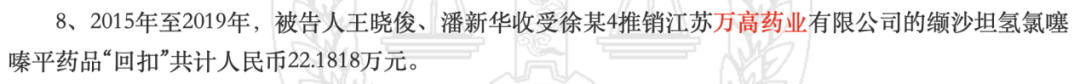 然而,「界面新闻?子弹财经」在中国裁判文书网发现,2015年至2019年,被告人王晓俊、潘新华收受“徐某4”推销万高药业的缬沙坦氢氯噻嗪平药品“回扣”共计人民币22.1818万元。