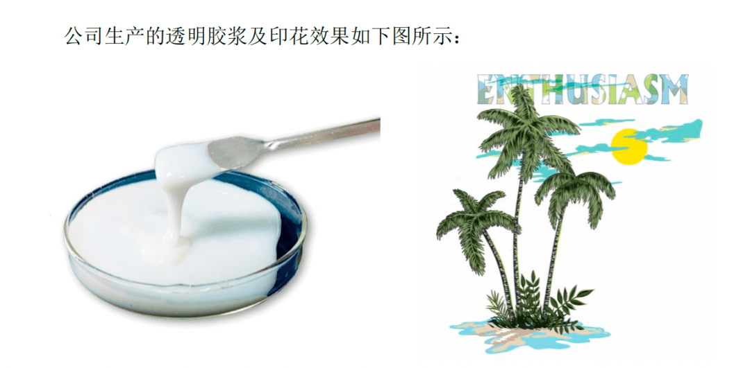 例如,公司所生产的水性印花胶浆,是以聚丙烯酸酯乳液、聚氨酯乳液、乙烯-醋酸乙烯酯乳液等作为水性树脂固着物,与粉体或助剂等混合制备而成的浆状物。水性印花胶浆应用在纺织印花上,具有环保、手感柔软、耐洗水、耐摩擦等特点。
