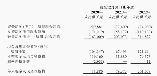 报告期内,喜相逢在2020年经营性现金流流入2.30亿元,2021年和2022年公司经营性现金流分别流出7740.9万元和7400万元,2021年和2022年之所以能维持年末现金流为正,完全是靠融资来弥补日常经营性现金流流出。
