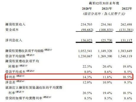 所谓利差,指公司向汽车租户收取的利息和公司向银行贷款利息的价差。数据显示,2020年至2022年,公司净利差分别为14.3%、11.8%、10.5%,喜相逢净利差逐步减少。