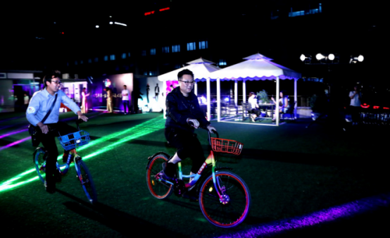 图为发布会现场嘉宾体验七彩单车欢快骑行的画面