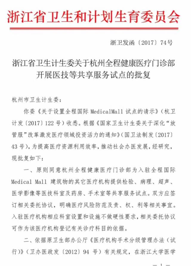 这个共享医院,可不是草台班子,而是经过浙江省卫计委专门批复同意了的。