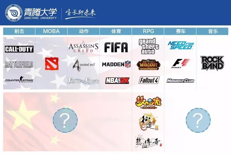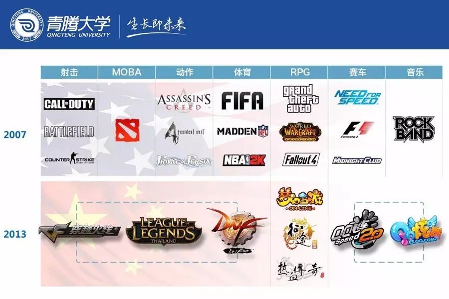 回顾2007年的市场格局和细分品类分布,中国市场的主导品类是RPG(角色扮演游戏),而反观以美国市场为代表的全球成熟游戏市场,其实品类很丰富,有体育、赛车、音乐、射击等各种不同类型。