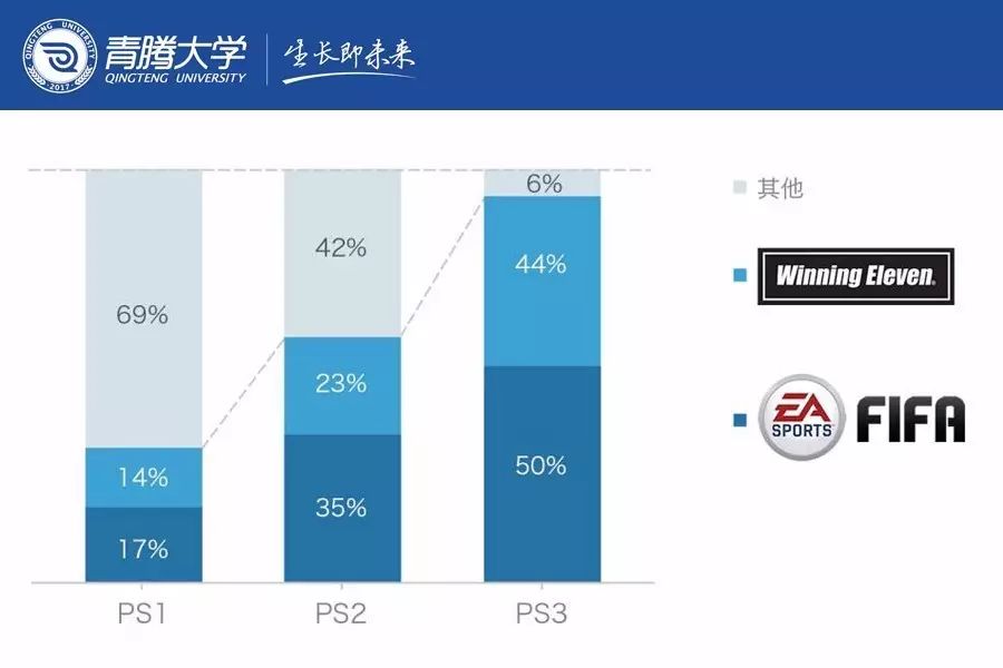 以足球游戏为例。第一名是FIFA,第二名是Winning Eleven。大家对第三名则知之甚少。拿全球的PC游戏来举例,往往第一二名占据了主流的大众市场,加起来通常能够占到整个游戏类型当中的90%以上的市场份额。