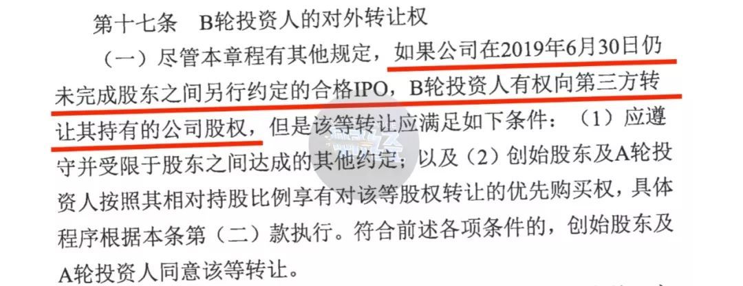 在第八章公司股权转让中第十七条,B轮投资人对外转让权中这样写道:“如果公司在2019年6月30日仍未完成股东之间另行约定的合格IPO,B轮投资人有权向第三方转让其持有的公司股权。”