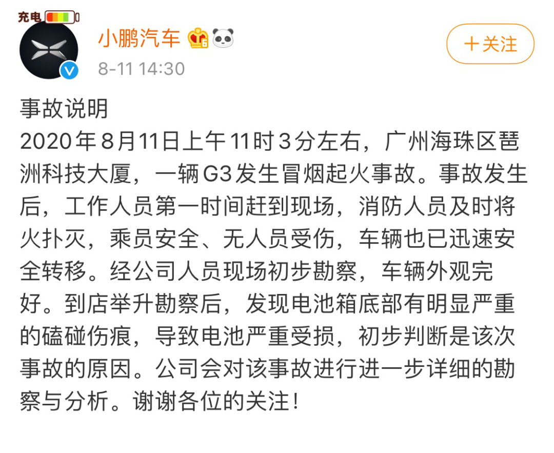 而刚上市不久的小鹏汽车在汽车故障上也没“跑掉”。2020年8月在准备上市期间,小鹏G3在广州发生冒烟起火事故。虽然目前事故依然在调查中,但大概率是由于电池使用的问题造成的。