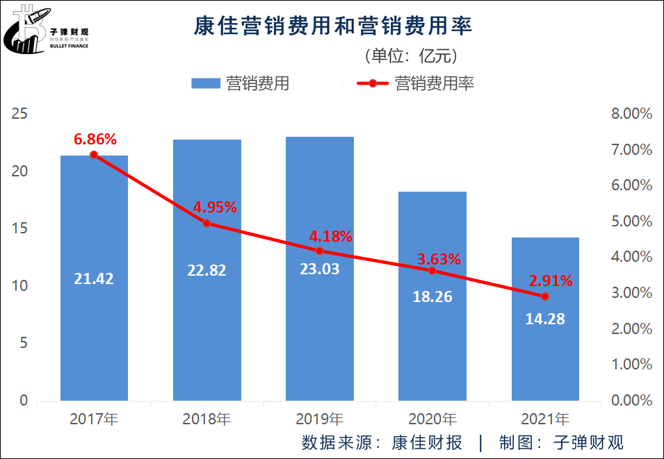 康佳披露的财报信息显示,最近5个年度,该公司的营销费用率(营销费用率=营销费用/营收*100%)一直维持在2%至7%之间,处于极低的水平。