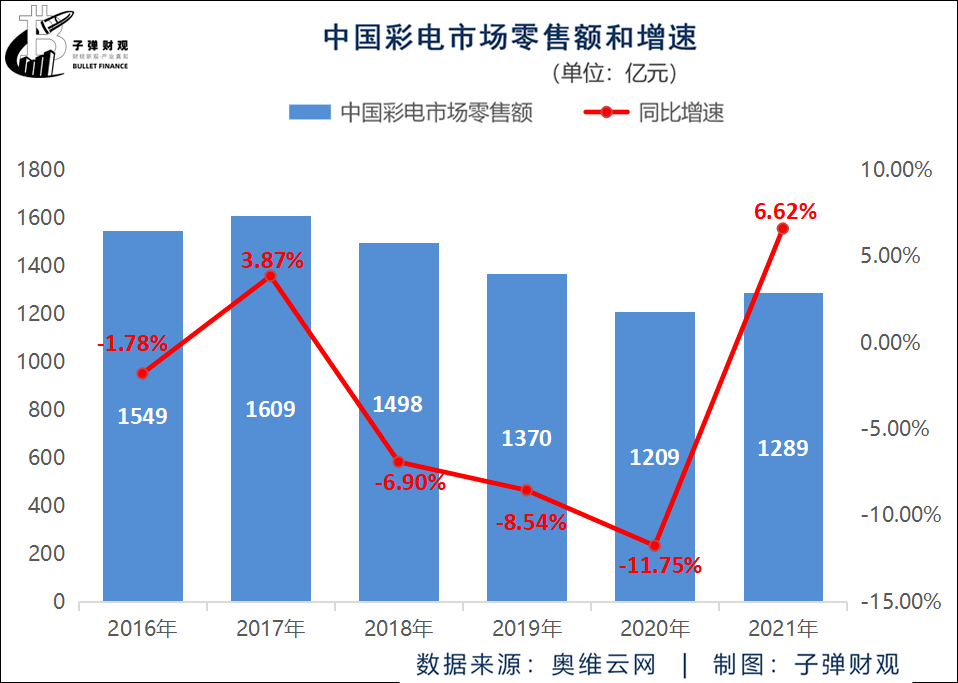 根据奥维云网数据,在过去的6个年度里,中国彩电市场零售额已从2016年的1549亿元缩至2021年的1289亿元。