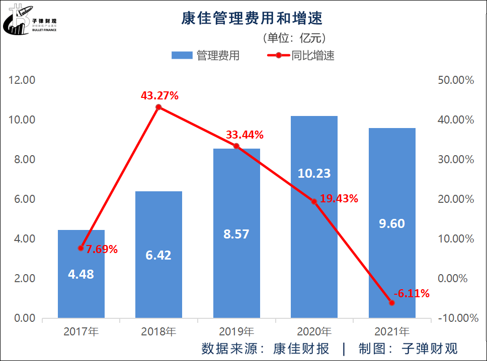 而且,除了2021年管理费用增速为负,康佳在其他年度的这一数值均为正值,平均增速达19.54%。