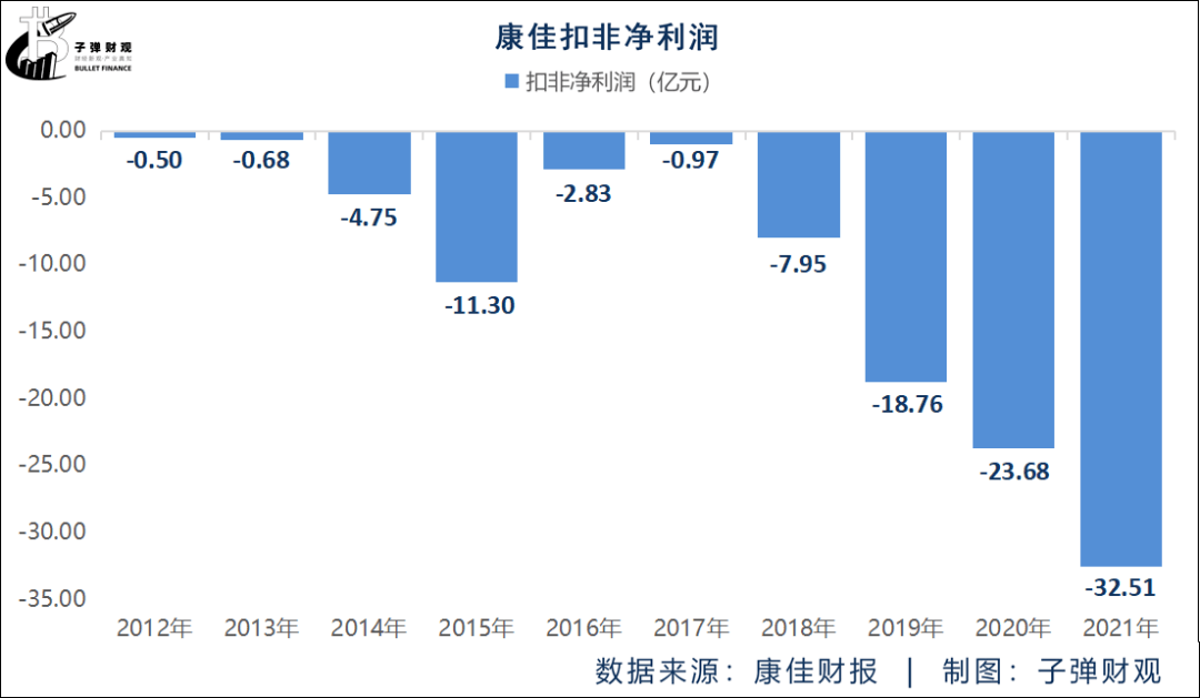 我们知道,扣非净利润才是反映一家企业真实盈利能力的财务指标。而根据财报,在过去的10个年度里,康佳的扣非净利润一直为负值,累计达到-103.93亿元。