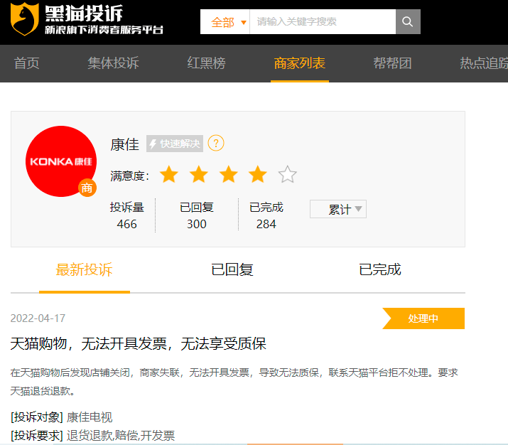 「子弹财观」还注意到,康佳的营收失速也跟其口碑信誉下滑有关。在黑猫投诉平台上,涉及康佳的投诉合计高达466条,而网友们对康佳的投诉主要为产品质量差、售后服务差、广告骚扰、乱扣费以及退货难等。